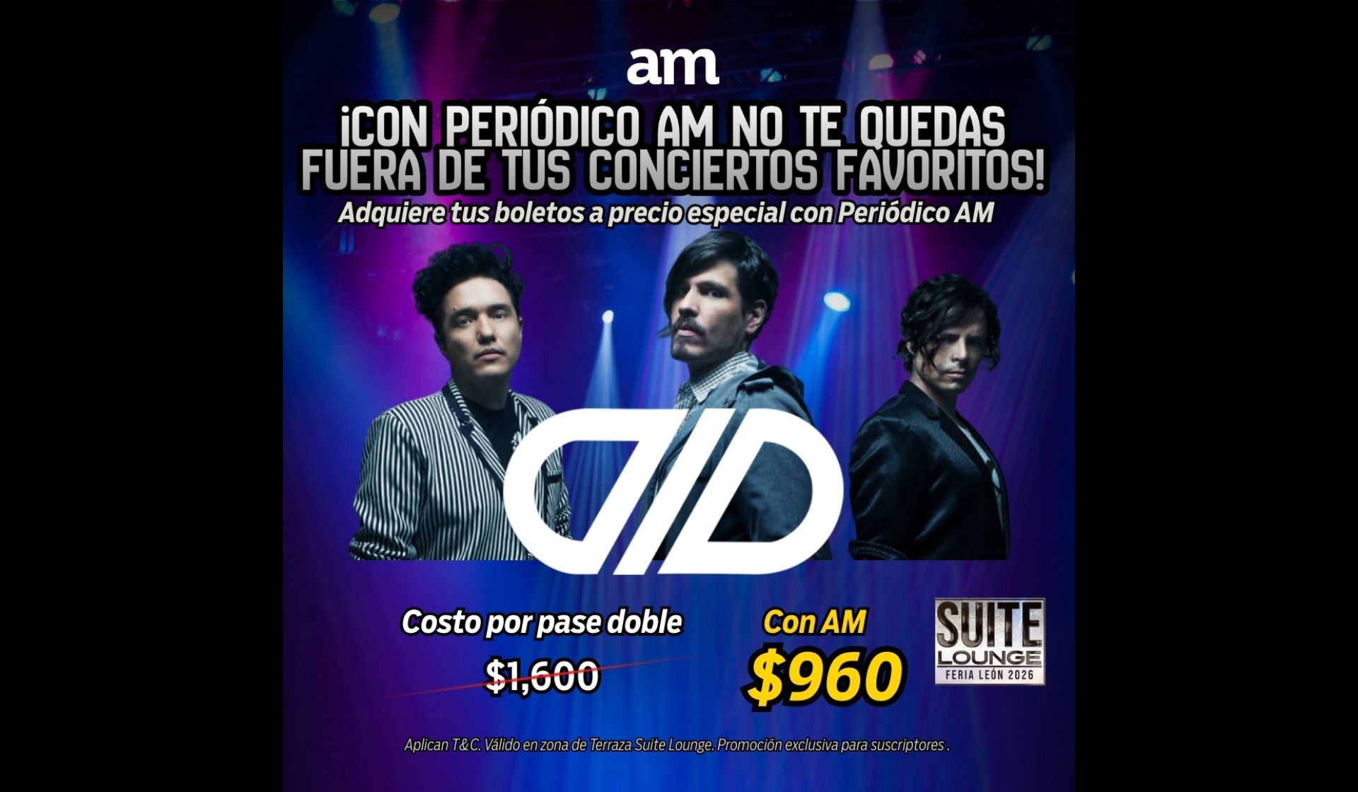 Obtén tu pase doble. Una experiencia exclusiva para suscriptores AM. Vista frontal al escenario, excelente servicio, Baños VIP. Vive el concierto desde Suite Lounge en el Foro Mazda, Feria León 2026. Una vez realizado el pago, nuestro equipo te contactará para confirmar tus accesos.