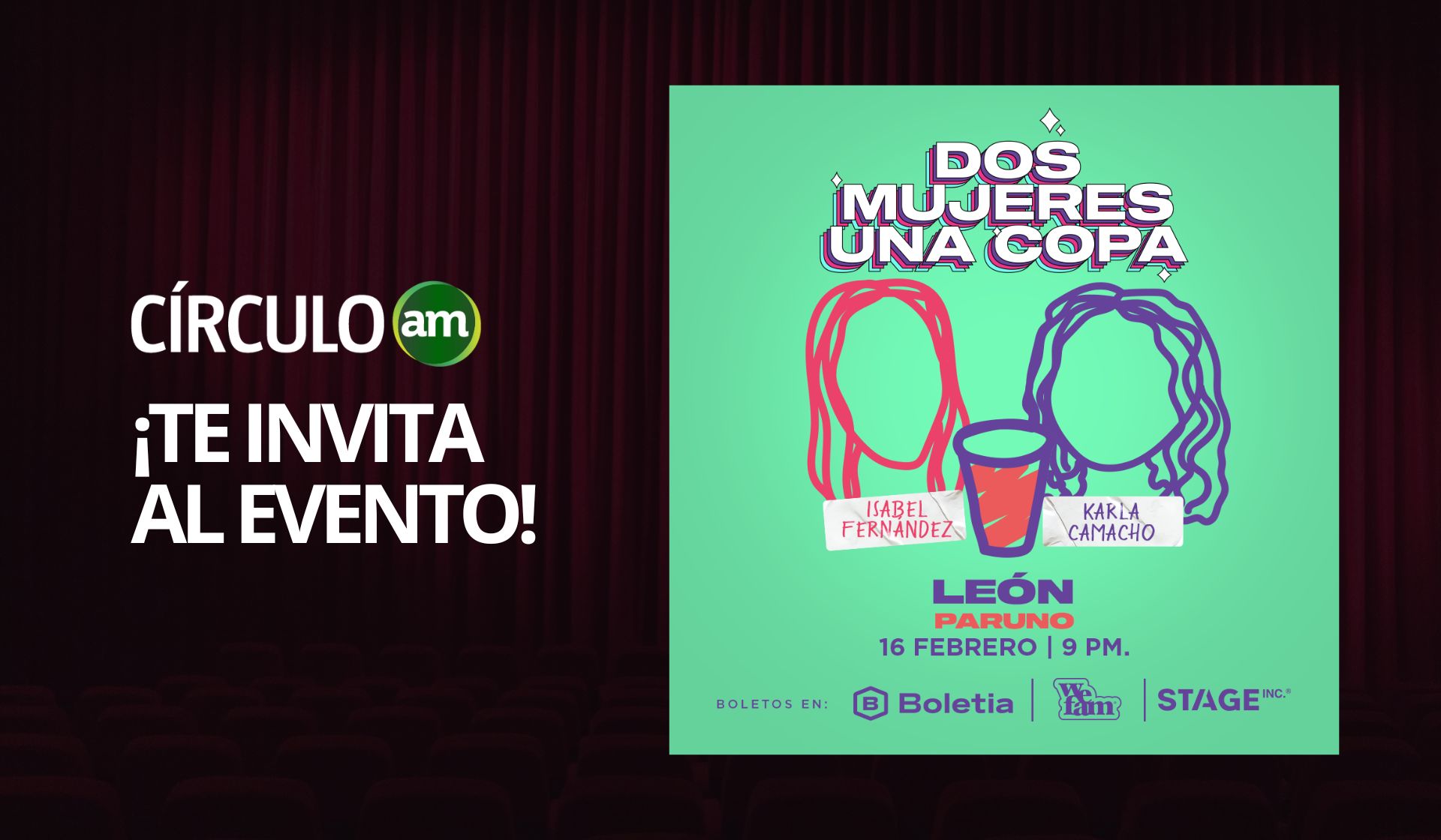 Isabel Fernández y Karla Camacho regresarán el 16 de febrero a Foro Paruno con el show en vivo de su podcast “Dos mujeres, una copa", en el que platican anécdotas personales y escuchan las notas de voz más bizarras que su público les envía, de las cuales dan su punto de vista mezclado con un toque de comedia.
